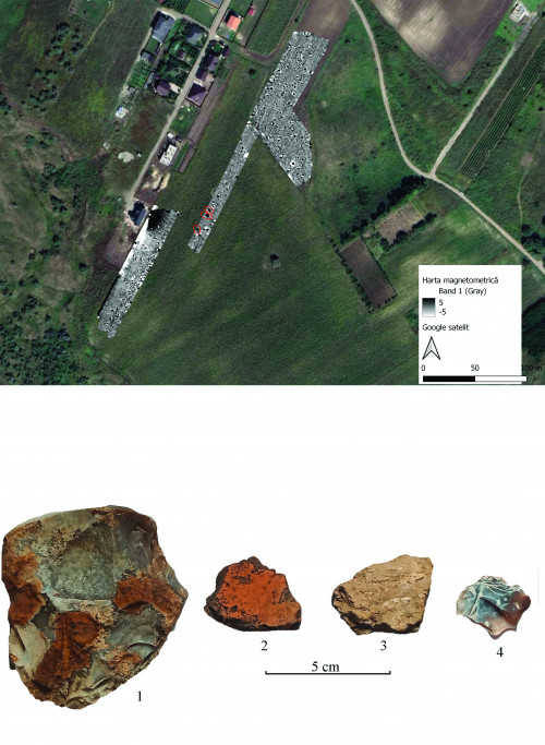 Partea de sud-vest a Platoului Mârzești (administrativ: strada Busuiocului din satul Breazu). Cu ocazia unor lucrări de construcție din anul 2021, a fost distrusă o groapă menajeră cu materiale arheologice aparținând eneoliticului, mai precis culturii Cucuteni, faza B (localizare GPS: 47013’36.49’’N, 27029’29.86’’E). Din acest motiv primul punct cu potențial arheologic verificat în cadrul acestui diagnostic a fost respectiva locație. Aceasta se află lângă un teren arabil, cultivat la momentul realizării diagnosticului. Astfel, am întreprins o periegheză la sud, nord și est de acest punct, pe o suprafață de cca 1 ha (fig. 1/1) (suprafața de la vest de acest punct este acoperită de drumul comunal și de alte construcții, nefiind astfel accesibilă pentru o periegheză). În urma cercetării de teren au fost identificate foarte puține artefacte la suprafața solului: fragmente ceramice,fragmente de oase de animale și un nucleu amorf din silex (fig. 2B/1-3) specific depozitelor Cenomaniene de pe malul râului Prut. Preliminar, estimăm, în funcție de răspândirea materialului arheologic de la suprafața solului, că este posibil ca situl arheologic să se întindă pe o suprafață de cca 1 ha la est de complexul arheologic distrus în anul 2021. Cu această ocazie am realizat și prospecțiuni magnetometrice pe terenul respectiv. Magnetometria este una dintre cele mai productive metode aplicate în arheologie datorită combinației dintre rata deosebit de rapidă de achiziție a datelor, în perioade relativ scurte de timp, și rezoluția spațială foarte bună a rezultatelor obținute, ce depășesc cu mult orice altă metodă de cercetare geofizică terestră. Pentru cazul de față s-a utilizat un magnetometru fluxgate, marca Sensys, cu cinci probe, măsurându-se câteva suprafețe apropiate, dar nu în legătură (însumând cca. un hectar), pentru a se surprinde eventuale complexe arheologice, limite ale așezării etc. Din păcate, măsurătorile nu au surprins anomalii specifice unei așezări cucuteniene (locuințe incendiate, cuptoare, șanțuri de apărare/delimitare), acestea fiind într-o bună măsură afectate și de amenajările antropice recente din zonă (locuințe, garduri metalice etc.). Singurele elemente de interes arheologic ar putea fi un grup de anomalii pozitive, de intensitate medie și formă cvasi-ovală, situate în relativă apropiere groapa cu materiale Cucuteni. Și acestea ar putea indica gropi cu conținut ars relativ puternic (ceramică, lipituri arse) (Fig. 2A). Din păcate, din cauza faptului că terenul pe care se află situl nu a fost curățat de resturile agricole, nu am reușit să scanăm toată suprafața, ci doar unele porțiuni care au fost curățate în prealabil.