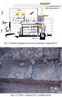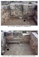 Astfel în S1/2013 a fost repus în evidenţă zidul perimetral de nord al edificiului, zid aflat azi la 30-40 cm sub actualul nivel de călcare, dar care apare în publicaţiile mai vechi (planurile I şi II din finalul monografiei Capidava I, 1958) ca fiind la suprafaţă, la nivelul solului actual. În această suprafaţă au fost descoperite şi urmele a două bordeie medievale distruse, din alcătuirea cărora se poate totuşi distinge groapa şi podeaua interioară. De asemenea sub podelele medievale a fost cercetat ultimul nivel roman-târziu, cel de sfârşit de secol VI, cu distrugere şi ardere masivă. În acest nivel au fost apoi descoperite o cantitate importantă de ceramică romană specifică perioadei, dar şi un perete prăbuşit construit din cărămizi de chirpici. Peretele era dispus pe podeaua de lut gros şi foarte bine tasat, iar direcţia zidului pare a fi perpendiculară pe zidul perimetral de nord al edificiului. La demontarea acestui perete au apărut, printre cărămizile de chirpici, mai multe fragmente de amfore specifice acestui ultim secol de locuire romană la Capidava, în special din tipurile LR 2 şi LR 3, dar şi o amforetă de tip pontic întregibilă, aşezată pe podea, sub dărâmătură. La finalul campaniei a putut fi săpată şi podeaua de secol VI, urmând ca cercetarea mai amănunţită a nivelului de secol IV să continue în campania următoare. Din nivelul de secol VI în campania 2013 poate fi menţionat un fragment de platou estampat de tip ARS, cu motive mitologice şi antropomorfe (vezi ilustraţia însoţitoare prezentului raport, cf. Atlante I, p. 134, motivele nr. 394 şi 422 reprezentând un personaj feminin în bust şi pe Dionysos frontal, stilul E(ii) – databil între 530-600 A.D., pl. LXIII/13 şi LXIV/5).