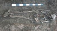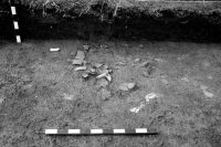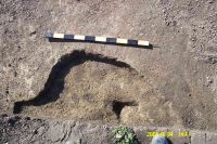La adâncimea de 0,44 m s-a conturat un strat de chirpici, necompactat, pe o suprafaţă de cca. 5 m², plecând din profilul sudic al casetei şi continuând pe direcţie nordică (între m. 2,40 şi 4,20). Este important de menţionat că zona cu o aparentă concentraţie mai mare de chirpici cuprinde o fâşie, aprox. între m. 3,30 şi 3,90, pe o lungime de 1,70 m, orientată perpendicular pe profilul sudic al casetei. Situaţia se oglindeşte în profilul sudic printr-o lentilă cu o grosime constantă de aprox. 0,26 cm, care coboară treptat, de la m. 4 înspre m. 2,20, unde ajunge la adâncimea de 0,80 m. Apariţia acestei platforme de chirpici poate fi interpretată ca reminiscenţele unei locuinţe, respectiv un perete dărâmat, însă cu un anumit grad de incertitudine. Situaţia se complică prin apariţia unui schelet uman, a cărui parte superioară coincide ca amplasament cu o parte din suprafaţa de chirpici. Este foarte posibil ca acest schelet uman să taie restul locuinţei, în aşa fel încât, din ceilalţi pereţi să rămână resturi sporadice de chirpici, împrăştiate de jur împrejurul scheletului, dar nu în cantităţi considerabile. Un argument suplimentar care vine să susţină această ipoteză este lipsa inventarului din preajma scheletului, excepţie făcând câteva fragmente ceramice şi orientarea lui pe direcţie V-E, motive care pot să indice cu un anumit grad de certitudine o datare mai târzie, spre sfârşitul mileniului întâi al erei noastre şi începutul celui următor. Că resturile de chirpici provin de la un perete dărâmat, e cu atât mai uşor de susţinut, cu cât apar fragmente de chirpici cu urme de paie impregnate în. Nu se poate estima suprafaţa ocupată de locuinţă. Materialele ceramice recuperate din aria cu chirpici sunt preponderent de factură romană. În preajma scheletului uman, ceramica caracterizează cronologic atât epoca romană, cât şi un orizont medieval timpuriu, de încadrat cel mai probabil în sec. VIII-XI. În ceea ce priveşte mormântul, groapa acestuia nu s-a conturat cu precizie. Individul, aşezat în decubitus dorsal, cu mâinile pe lângă corp şi palmele subduse parţial oaselor bazinului, avea o înălţime de cca. 1,65, capul culcat spre stânga şi zdrobit datorită presiunii solului. Au fost recuperate aproape toate oasele scheletului, mai puţin câteva vertebre, rotula piciorului stâng şi laba piciorului stâng (în afara unui metatarsian, situat la câţiva centimetri de originea anatomică). Cum s-a mai precizat, individul nu beneficia de inventar, iar ceramica din apropierea sa, imposibil de reconstituit în vase întregi, face parte cel mai probabil din alt context arheologic. Informaţiile preliminare arată că este vorba despre o femeie, cu vârsta cuprinsă între 25-30 ani.
