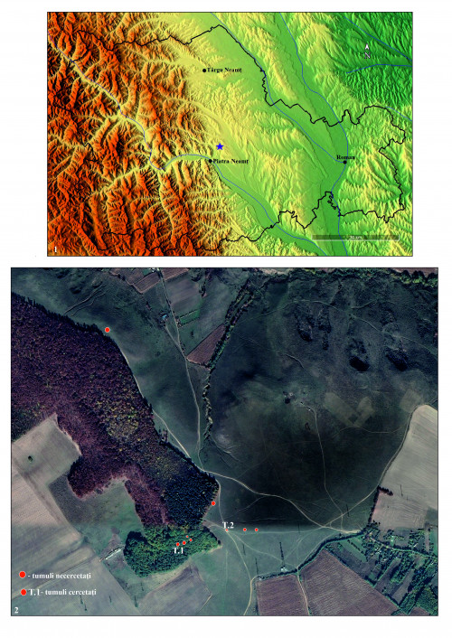 The mound T. 2, partially affected by a earth road, was investigated through two parallel sections (S.I and S.II). In the case of this funerary monument, we mention the discovery of a single cremation grave, placed peripherally. It is about a vessel in which cremated bones were deposited, covered with fragments from another vessel. Based on the characteristics of the ceramics, the archaeological complex can be assigned to the II-I century BC.