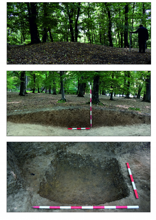 Una dintre movile a fost distrusă parțial de un șanț de delimitare a zonei forestiere, iar o altă movilă era afectată de un drum de țară. Pentru a afla originea acestor formațiuni a fost realizat un diagnostic intruziv în cazul uneia dintre movile, denumită de noi T.1, aflată în zona împădurită. Fiindcă în jumătatea estică a acesteia se afla un arbore pentru care nu a existat o aprobare să fie tăiat, săpătura a afectat doar o parte a tumulului (Fig. 2/1).
