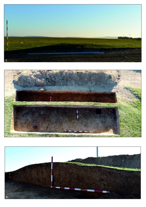 Un alt sondaj intruziv a fost realizat și în cazul tumulului afectat de drumul de țară, denumit T.2 (Fig. 3/1). Dimensiunile mici ale movilei (diametrul - 6 m; înălțime - 0,5 m) au făcut ca aceasta să fie destul de afectată de eroziune, motiv pentru care au fost realizate două secțiuni paralele, pentru a se obține date stratigrafice, dar și pentru a avea o încadrare cronologică a construcției funerare (Fig. 3/2).