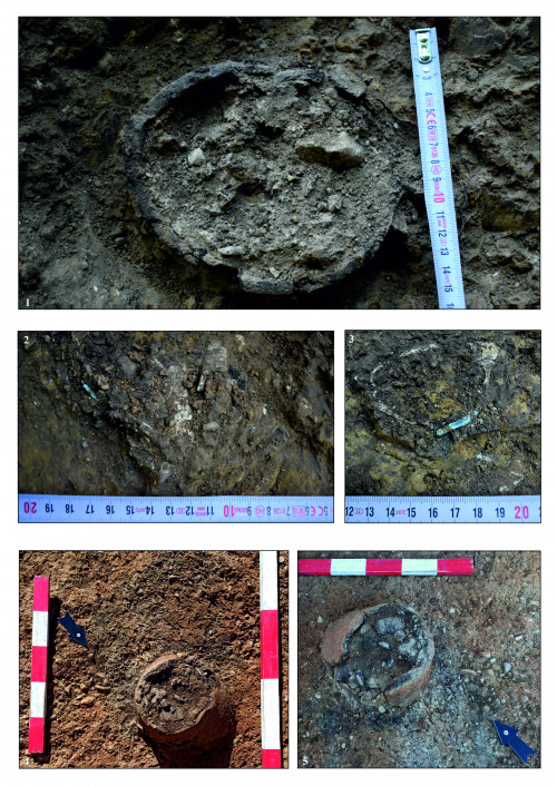 În partea sudică a complexului adâncit, pe o suprafață foarte restrânsă, au fost observate resturi osteologice calcinate, foarte slab conservate, în asociere cu câteva piese de bronz și sticlă (Fig. 4/2). Este vorba de două capete de ace, elicoidale, realizate din bronz, trei mărgele din sticlă, de culoare maronie, dar păstrate deficitar, precum și o fibulă cu placă triunghiulară, tot din bronz, extrem de rău conservată (Fig. 4/3). Pe baza cronologiei stabilite pentru capetele de ace elicoidale, mormântul de incinerație poate fi atribuit sec. VI-V a. Chr.