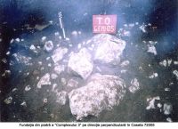 S-a constatat existenţa unei fundaţii din bolovani mari de calcar, care la prima vedere părea să constituie un zid de terasă.