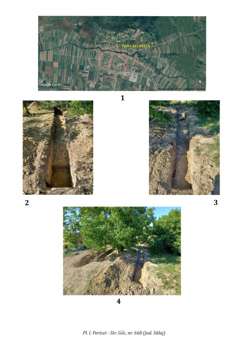 The archaeological site from Pericei „Str. Góc, no. 668" is known through preventive archaeological research (carried out here in 2017 and 2020-2021) which led to the discovery of traces of a medieval church that disappeared in 1660. The main objective of the research was to identify the existence of medieval vestiges (medieval church) on a private land located southwest of the investigated surface through preventive archaeological excavations in the previous years (2017, 2020-2021). The archaeological diagnosis in 2022 aimed to identify the walls (long sides of the nave) of the disappeared medieval church in this area as well. Two sections were drawn (S. 1/2022 and S. 2/2022), arranged parallel, oriented N-S, with dimensions of 1,20 m x 17 m each. Were identified the paths of the foundations of some stone walls (completely stripped from antiquity). The two identified walls ("cut" perpendicularly by the two archaeological sections) represent the N and S sides of the nave of the old disappeared medieval church. Also, an inhumation grave (C. 1/2022) and scattered (in ancient times) human bones were identified as a result of stone spoliation activities. From the archaeological layers come a series of medieval artifacts: ceramic fragments, architectural stone fragments, coins.