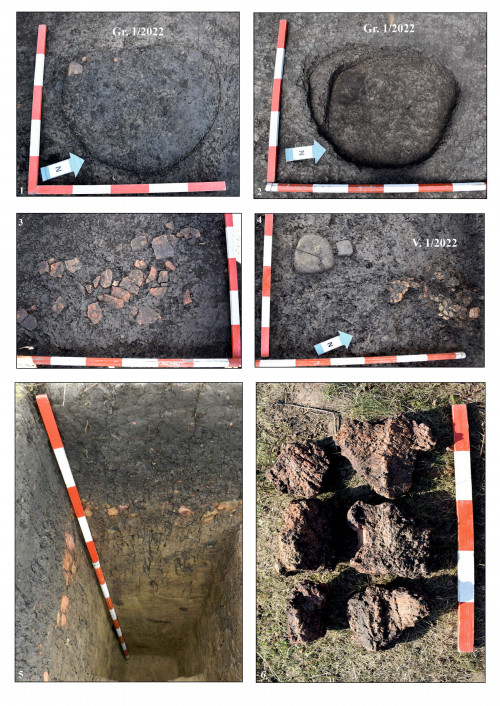 În campania din anul 2022 principalele obiective au fost verificarea unor anomalii indicate de scanările geo-fizice, care au fost interpretate ca fiind posibile gropi și o locuință, dar și prelevarea unor probe pentru studii interdisciplinare (arheozoologie, pedologie, datări absolute, analize polinice). Într-o primă fază a fost trasată o secțiune (S.VIII), în partea de nord a sitului, orientată N-S, pe terenul lui G. Arnăutu, la limita de propietate cu D. Olteanu. S. VIII a avut o lungime de 20 m și lățimea de 2 m, fiind împărțită în 10 carouri egale (Fig. 1/1, 2). Deși în perimetrul respectiv erau indicate câteva posibile gropi, cercetarea arheologică a infirmat acest fapt. Singurul complex arheologic identificat în această suprafață (Cplx. 1) a fost un segment dintr-un șanț îngust, cu profilul dreptunghiular, care a fost săpat, cel mai probabil, în perioada modernă, așa cum o arată observațiile stratigrafice (Fig. 1/3). În umplutura sa au fost identificate doar câteva fragmente ceramice atipice și bucăți mici de chirpic ars, provenite din solul folosit la umplerea respectivului șanț. Având o lățime maximă de 0,40 m și adâncimea de 0,70 m, șanțul era orientat NV-SE, fără a putea fi stabilită, în acest moment, utilitatea sa.