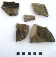 Ceramica fină, din pastă bine aleasă, are în compoziţie nisip fin şi mică. Arderea este oxidantă, uniformă, predomină culoarea castanie dar şi neagră şi cenuşie. Se remarcă un fragment de culoare cărămizie, decorat cu un brâu simplu organic, în relief, dispus la partea superioară a vasului. Sub brâu, două linii incizate dispuse vertical, încadrate de câte un rând de impresiuni. Ca formă, fragmentul aparţine unei căniţe. Alături de fragmentele ceramice au fost descoperite o râşniţă fragmentară cu dimensiunile de 0,18 x 0,12 x 0,04 m şi un frecător cu dimensiunile de 0,18 x 0,05 m.