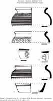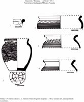 Ceramica din pastă nisipoasă (aspră cu nisip şi mică în compoziţie), este reprezentată numai de vase borcan, de dimensiuni mici şi mijlocii, din care s-a întregit un vas, singurul care are o marcă de olar în relief (Pl. 6/5). Forma buzelor este mai variată: sunt înalte, evazate, cu marginea rotunjită dar întâlnim şi exemplare cu buza răsfrântă şi îngroşată. Decorul acestora, destul de variat, prezintă caneluri şi linii orizontale pe toată suprafaţa borcanului: buza unui vas de mici dimensiuni (singurul întregit) este decorată cu linii în val, motiv ce se reîntâlneşte pe toată suprafaţa. Pe umăr, întâlnim fascicole de linii în val, motiv înlocuit, uneori, de şiruri de împunsături oblice realizate cu pieptănul. Multe dintre fragmentele ceramice prezintă urme de ardere secundară pe ambele feţe, vasele rămânând pe loc datorită unui sfârşit violent.